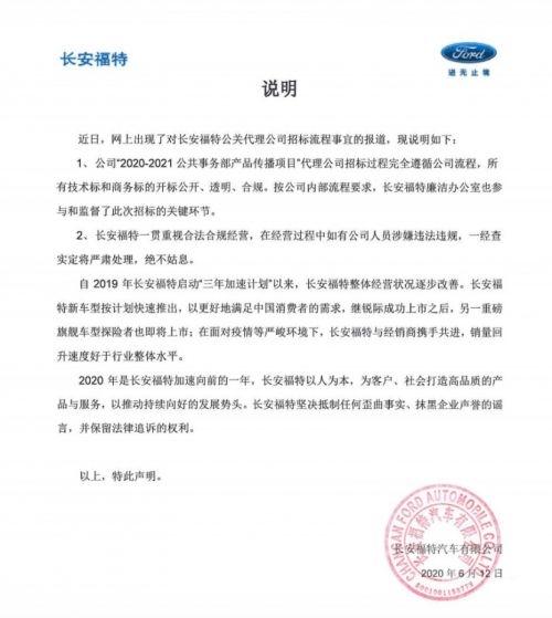 除此之外,6月12日,长安福特也作出正式回应,称公司“2020-2021公共事务部产品传播项目”代理公司招标过程完全遵循公司流程,所有技术标和商务标的开标公开、透明、合规,按公司内部流程要求。