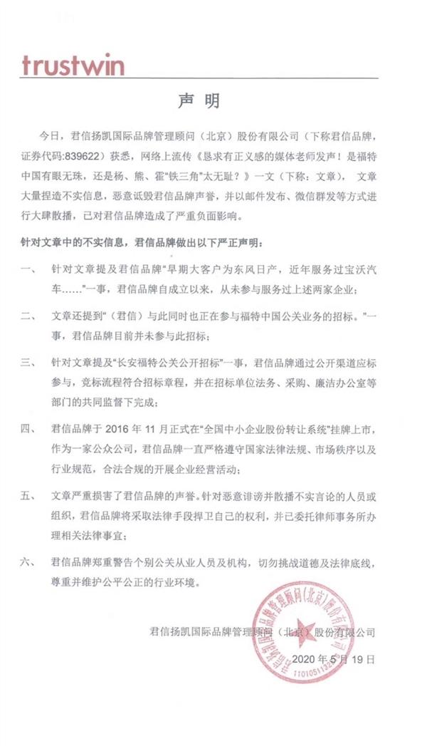 并且,‘长安福特公关公开招标’一事,君信品牌通过公开渠道应标参与,竞标流程符合招标章程,在招标单位法务、采购、廉洁办公室等部门的共同监督下完成。