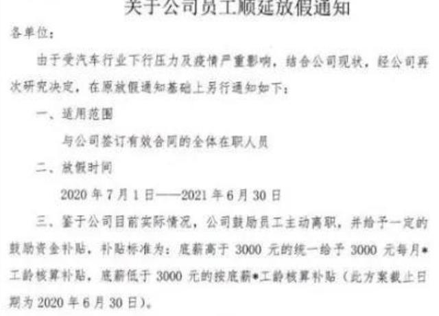 随后5月底,一则众泰汽车湖南基地停产一年的通告将众泰危机再次引爆。网传一份众泰汽车《关于公司员工顺延放假通知》中写到,因汽车行业下行压力及疫情严重影响,其湖南基地全体在职员工放假时间延期到2021年6月30日。通知另外称,“鼓励”员工主动离职,并给出了相应补偿标准:底薪低于3000元者,以底薪乘工龄核算补贴,高于3000元者,以3000元乘工龄核算补贴。