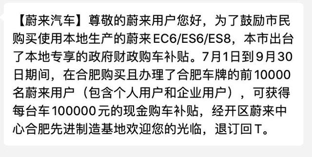近日,网络上流传一张合肥本地用户购买蔚来汽车享受高额补贴的图片。图片内容显示,为了鼓励市民购买使用本地生产的蔚来EC6/ES6/ES8,7月1日至9月30日期间,在合肥购买且上合肥牌照的前一万名蔚来用户,可以获得10万/台的现金补贴,购车用户不限制是都是个人用户还是企业用户。同时,文中还显示,这笔购车补贴来自政府的财政购车补贴。
