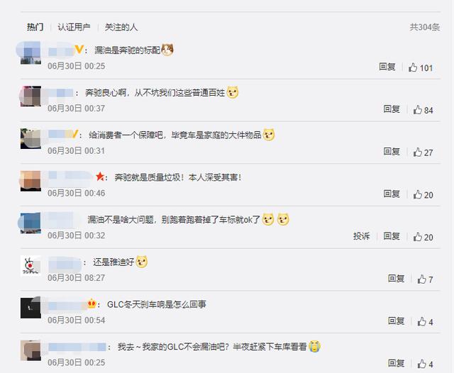 对于奔驰召回存在渗油隐患的车辆,这一做法大部分网友表示,“奔驰质量实在堪忧”、“奔驰从来不坑穷人”、“漏油是奔驰标配”等等,嘲讽和戏谑的字眼络绎不绝。