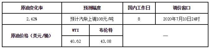 2020年7月10日(本周五),国内油价将开启新一轮调价窗口,截止7月8日0时,本轮国内第8个计价工作日,原油变化率为2.42%,预计汽柴油油价将上调108元/吨,已经超过50元/吨调整红线,上涨折合约0.08-0.1元/升。