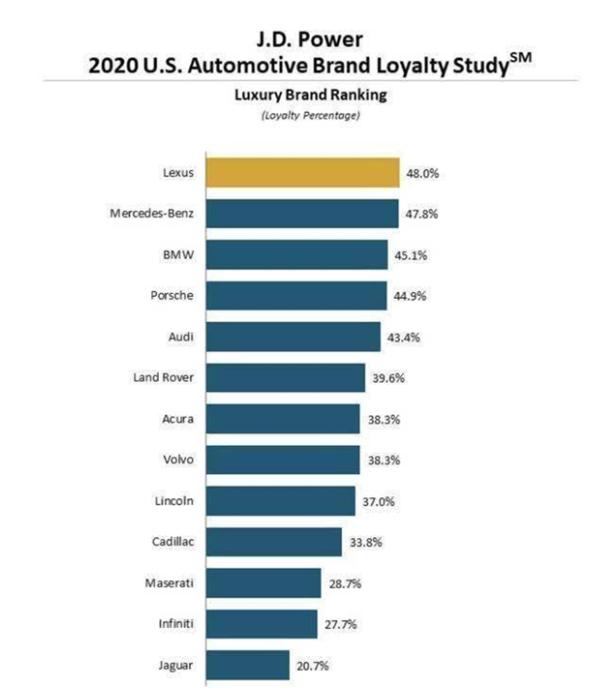 而在豪华品牌方面,雷克萨斯再度以48%位居榜首,梅赛德斯·奔驰以47.8%的忠诚度与雷克萨斯保持了很小的差距。宝马(45.1%)、保时捷(44.9%)和奥迪(43.4%)分列其后。值得一提的是,排在豪华品牌榜单末尾的则是捷豹,忠诚度仅为20.7%,远低于其他豪华品牌。