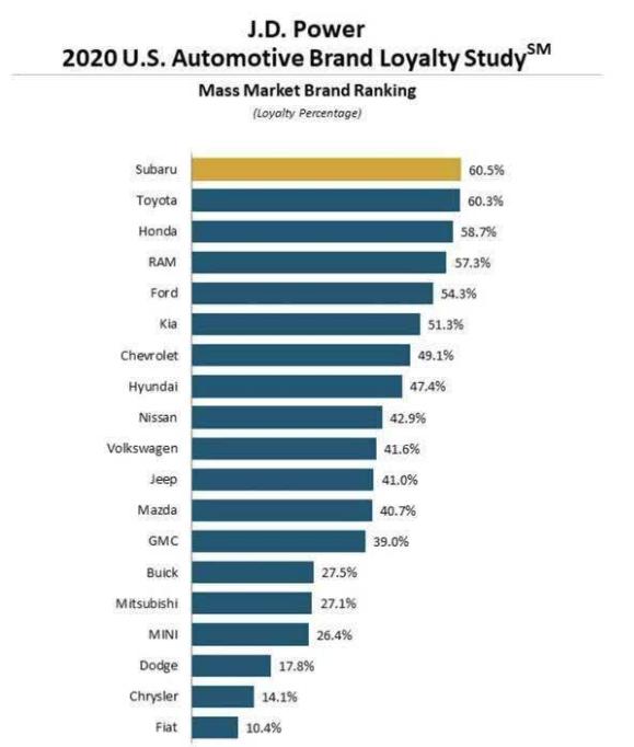 日前,J.D. Power发布了2020年品牌忠诚度排行报告,其中日系小众品牌斯巴鲁在普通品牌中排名第一,雷克萨斯则位列豪华品牌第一,这也是此两家车企连续第二年在各自细分排名中夺冠。