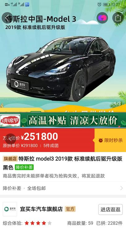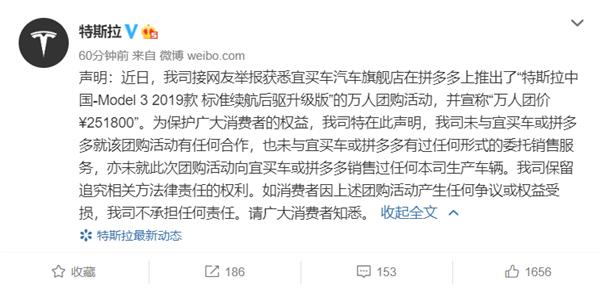 7月21日,特斯拉在其官方平台发布声明称,公司接网友举报获悉,拼多多上的宜买车汽车旗舰店推出了“特斯拉中国-Model 3 2019款 标准续航后驱升级版”的万人团购活动,并宣称“万人团价¥251800”。