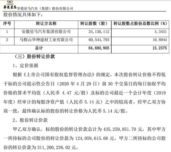 7月22日晚间,华菱星马(600375,股吧)发布公告,公司控股股东安徽星马汽车集团有限公司,及其全资子公司马鞍山华神建材工业有限公司,与浙江吉利新能源商用车集团有限公司,签署了《股份转让协议》,转让完成后,吉利商用车集团将持有公司15.24%股权,为公司控股股东。