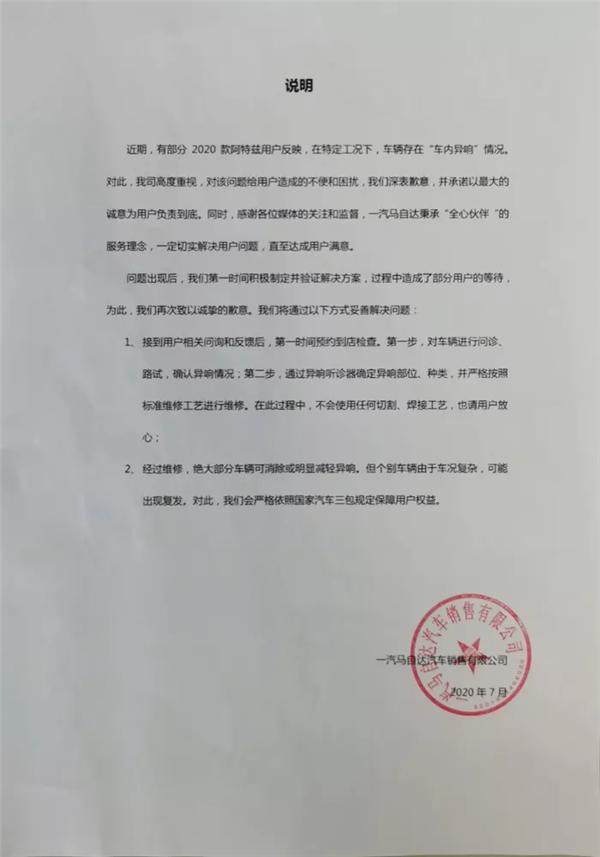 对此,近日一汽马自达官方又发布声明,承认“车内异响”问题,并表示将会对部分2020款阿特兹用户反映的“异响问题”进行妥善解决。