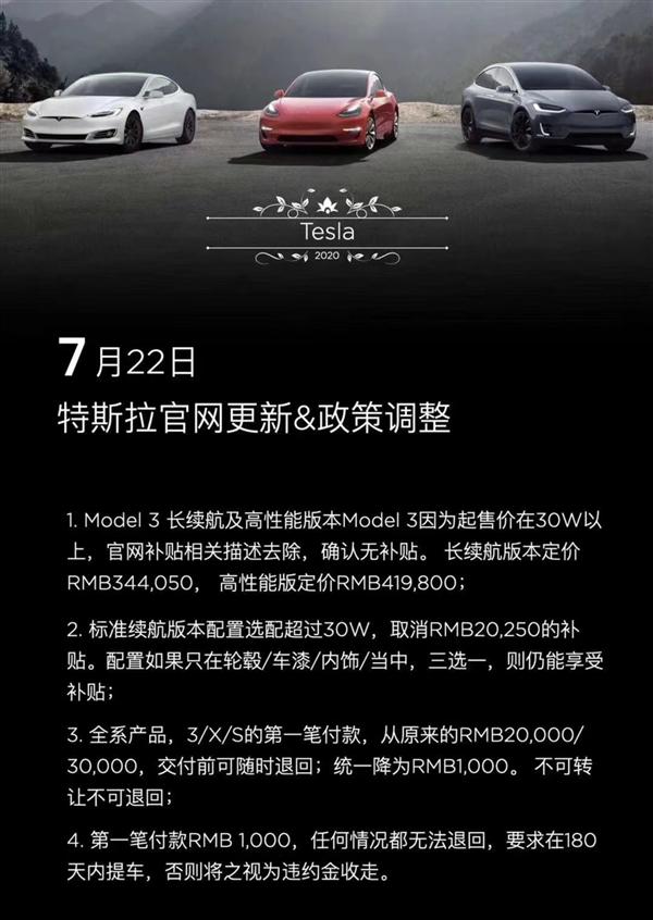 实际上,此次三个政策中只有定金调整算是新消息。因为此前特斯拉方面已经宣布,将在7月22日补贴取消后,自发对国产Model 3长续航版本进行额外补贴,维持34.405万元的售价,不会因为补贴过渡期过了而涨价。