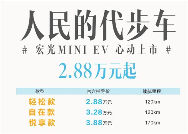 翻看目前市面上在售的乘用车列表,五菱宏光MINI EV的2.88万元的价格已经刷新当前在售新车的最低价格,此前乘用车销售的最低价格车型为五菱同门兄弟宝骏旗下的小型车310,价格区间为3.68-6.08万元。