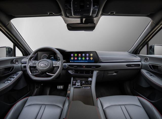 内饰方面,第十代索纳塔基本与海外版车型保持一致,无论在造型还是材质方面都较第九代有明显提升,在座椅、车门饰板、中控饰板以及中央扶手等处,均采用轻质织物和皮革结合的材质进行包裹,以提升车内质感。中控台由12.3英寸的LCD全液仪表盘和12.3英寸的中控触摸屏组成,下方空调控制面板也改为触控式,科技感较现款车型更加凸显。
