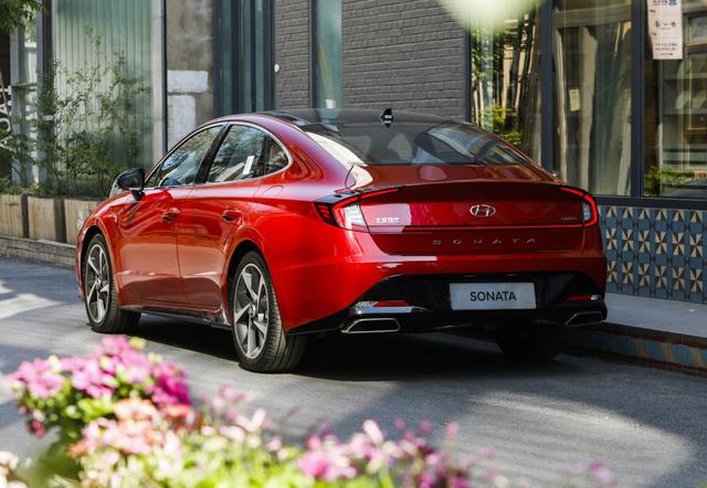 车侧采用了溜背式设计,长宽高分别为4955/1860/1445mm,轴距为2890mm,这一数据超过帕萨特、凯美瑞等传统B级车,同时,更宽和更长的车体造型更加凸显运动风格。尾灯使用了现代标志性的下贯穿式尾灯,搭配两侧“回旋镖”尾灯造型,同时下方设有“SONATA”字母标识。