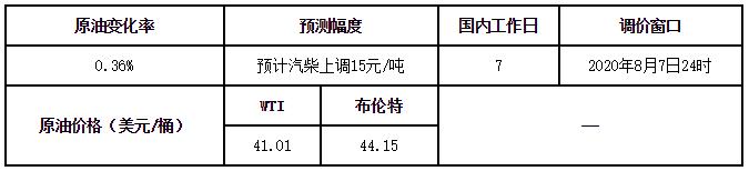 2020年8月7日(本周五),国内油价将开启新一轮调价窗口,截止8月4日0时,本轮国内第7个计价工作日,当前原油变化率为0.36%,预计汽柴油油价将上调15元/吨,尚未超过50元/吨调整红线。在本轮还有3个计价工作日的情况下,国内油价本周五搁浅的可能性或许更大,即便突破50元/吨调整红线,但涨幅也不会太大。