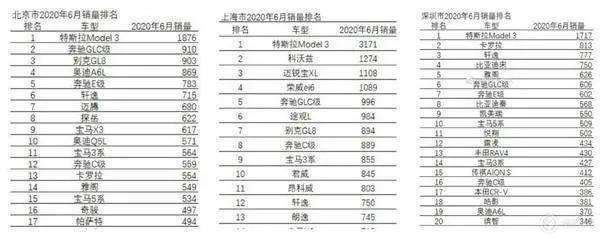 从销量上看,北京市、上海市、深圳市 6 月的销量排行榜上排名第一的均为特斯拉 Model 3,其中北京 6 月 Model 3 销为 1876 辆,高出卖出 910 辆的奔驰GLC (第二名)966 辆,上海市 Model 3 高出第二名科沃兹 1897 辆,深圳 Model 3 则高出第二名卡罗拉904 辆。总体来看,Model 3 均比第二名高出 2-3 倍。