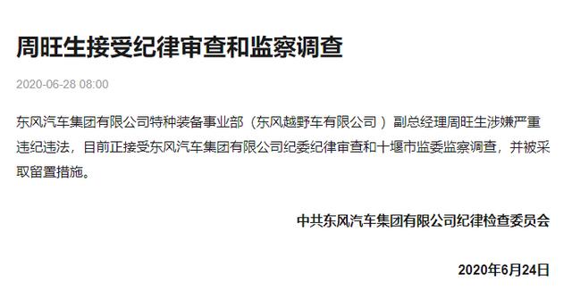 今年6月,东风官方微信曾发布《周旺生接受纪律审查和监察调查》的文章,内容显示,东风特种装备事业部(东风越野车有限公司)副总经理周旺生涉嫌严重违纪违法,目前正接受东风汽车集团有限公司纪委纪律审查和十堰市监委监察调查,并被采取留置措施。