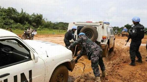 上面这两张图片非常“著名”,当时驻利比里亚的菲律宾维和部队的日产途乐越野车在通过泥潭时陷车,中国维和警察部队装备的猛士使用绞盘帮其脱困。