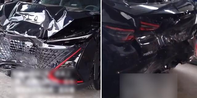 从车主拍摄的视频来看,新车尚未上牌,由于连环追尾,车辆前部和后部都受到了比较明显的损伤。其中车辆前部保险杠部分受损严重,前机盖也受力折起,发动机舱有小幅度入侵。尾部整体凹陷,后挡风玻璃破损。