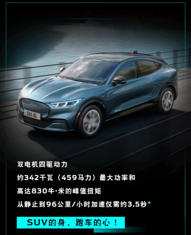 此前,福特中国旗下官方媒体曾对该车有过内容宣传,文章以“MUSTANG MACH-E不为人知的十大技能”为题对这台全新电动SUV进行了介绍,新车拥有可排水前备厢、B&O音响、手机开锁等高级配置,同时新车最快的百公里加速成绩可达3.5秒,WLPT工况下的纯电续航里程达600公里。