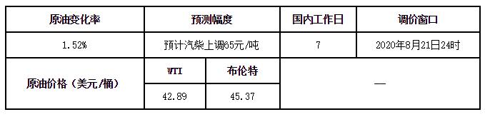 2020年8月21日(本周五)24时,国内油价将开启新一轮调价窗口。截止8月18日0时,本轮国内第7个计价工作日,当前原油变化率为1.52%,预计汽柴油油价将上调65元/吨,已经超过50元/吨调整红线,在本轮还有3个计价工作日的情况下,国内油价本周五将大概率迎来上涨。