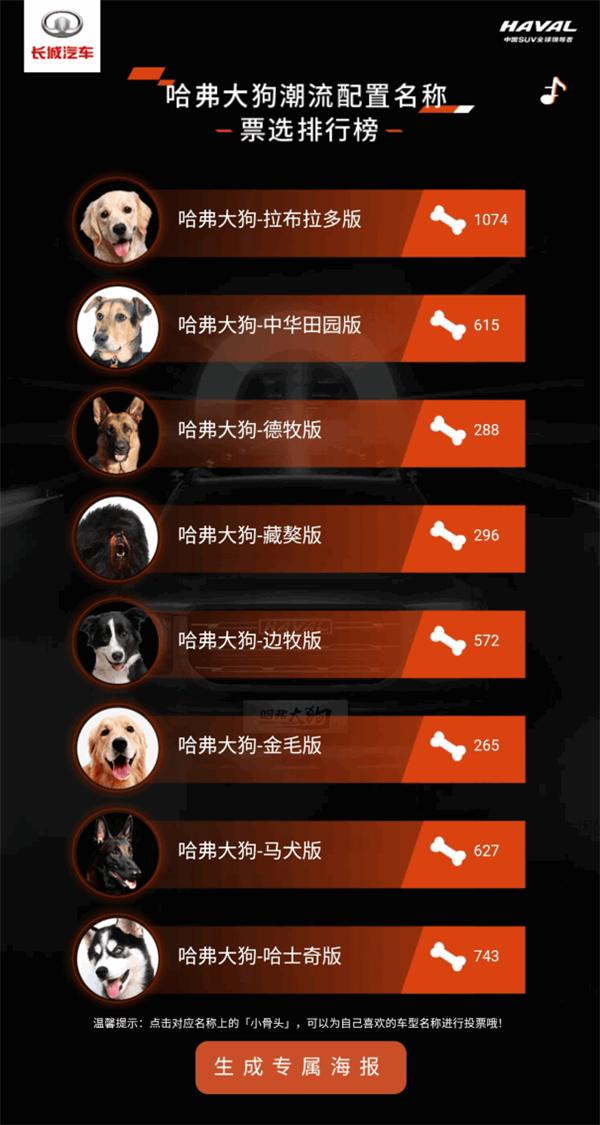 日前,和讯汽车从长城官方了解到,哈弗大狗的车型配置名称投票已经开启,在给出的“车型配置名称”选项中,可以看出有“拉布拉多版”、“中华田园版”、“德牧版”、“藏獒版”、“边牧版”、“金毛版”、“马犬版”、“哈士奇版”。