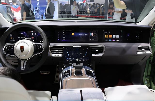 相比旗舰轿车H9,红旗E-HS9的内饰设计豪华取向更加明显,大面积的黑白双色真皮包裹,门板和中央扶手箱都有象征着豪华的菱形格纹路装饰。中控台部分配备了4块大屏幕,其中全液晶仪表盘与副驾驶仪表盘相贯穿,下方的空调控制面板也为液晶触控式。后排也配有2块液晶娱乐显示屏,全车屏幕数量达到6块。
