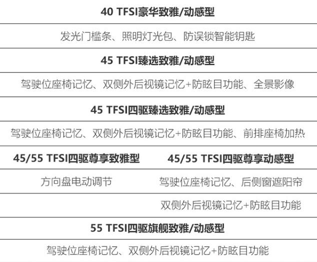具体来看,除40 TFSI豪华型2款车型外,其他车型全部新增了驾驶位座椅记忆、双侧外后视镜记忆+防眩目功能2项配置(45/55 TFSI四驱尊享致雅型以上配置为标配)。此外45TFSI臻选型还增加了全景影像,45TFSI四驱臻选型增加了前排座椅加热,45/55 TFSI四驱尊享致雅型增加了方向盘电动调节,45/55 TFSI四驱尊享动感型增加了后侧窗遮阳帘。同时,新车将全系升级最新安卓车机互联操作系统。