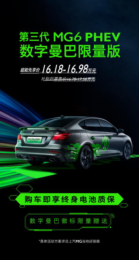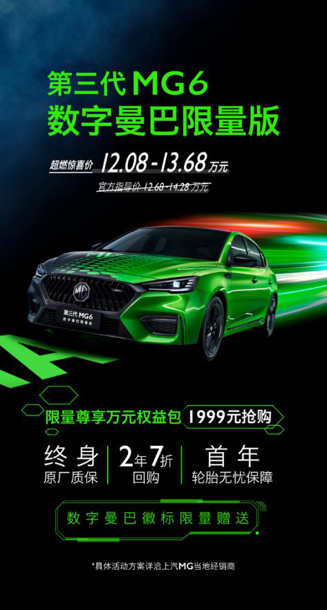 第三代MG6数字曼巴限量版共推出三款车型,官方指导价12.68万元-14.28万元,在6000元红包优惠的基础上,超燃惊喜价仅需12.08万元-13.68万元,现在购车还可1999元抢“限量尊享万元权益包”,包括终身原厂质保、2年7折回购、首年轮胎无忧保障;第三代MG6 PHEV数字曼巴限量版共推出两款车型,官方指导价16.78万元-17.58万元,在6000元红包优惠的基础上,超能先享价仅需16.18万元-16.98万元,购车即可享终身电池质保。消费者购买第三代MG6数字曼巴限量版车系还可享专属限量徽标。