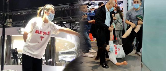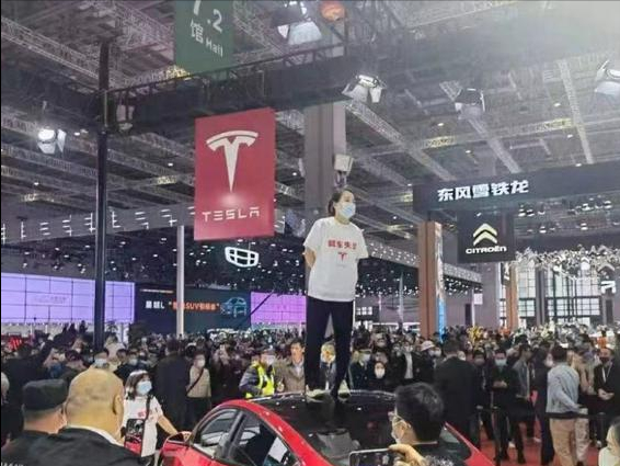4月19日,上海车展特斯拉展台上,一女车主身穿“刹车失灵”的白色T恤,站在特斯拉车顶上维权,高声呼喊:“刹车失灵”,随后这名女子被保安“抬四肢”带走。对此,特斯拉公关回应称,具体情况警方应该在调查。