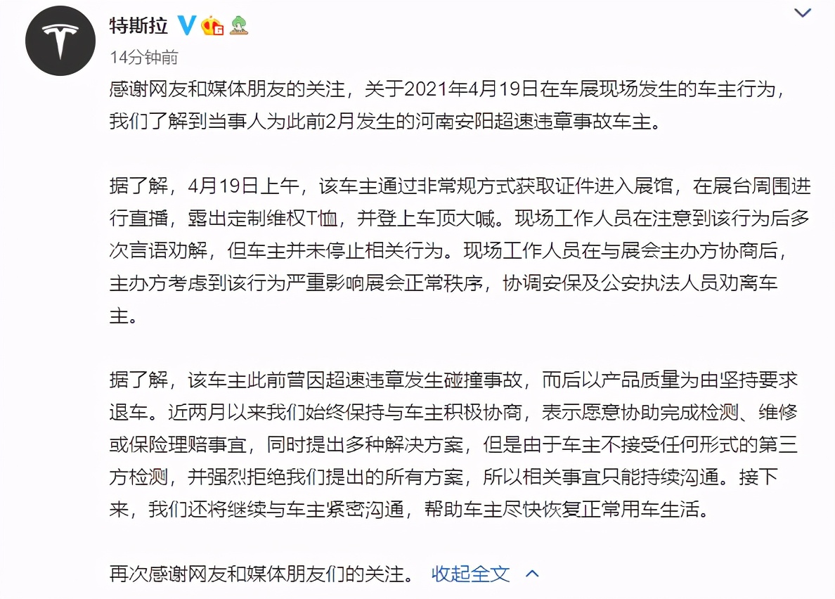 据和讯汽车此前报道,4月19日上海车展首日,特斯拉展台发生了车主维权情况。针对这一突发情况,特斯拉随后进行了回应。