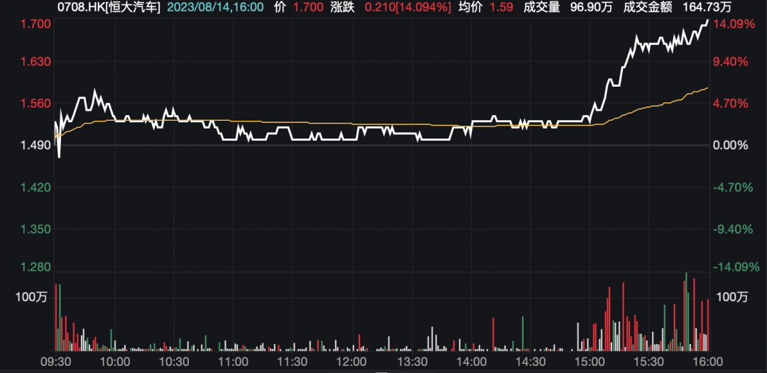 盘面上,恒大汽车今日尾盘逐步走高,截至收盘,大涨超14%。